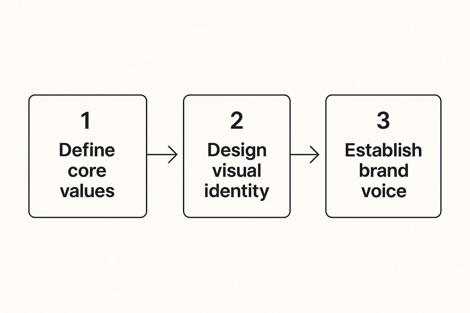 This flow shows how defining your core values, designing a visual identity, and establishing a brand voice all work together to build a strong foundation.