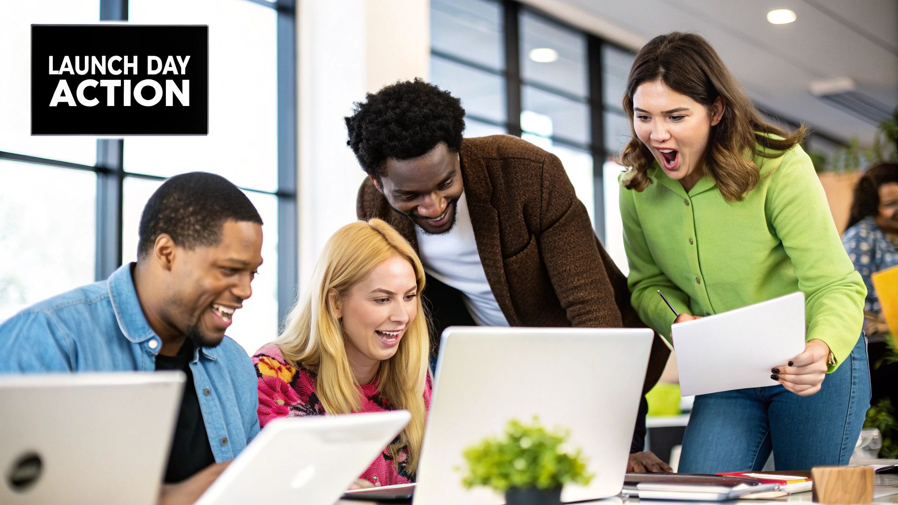 That first hour is all about activating your inner circle. It's time to cash in the goodwill you've built. Send out the pre-written announcement to your email list and share the news in those private communities you’ve been nurturing. The goal here is to create an immediate, powerful wave of engagement that signals to the Product Hunt algorithm that your launch is a big deal.