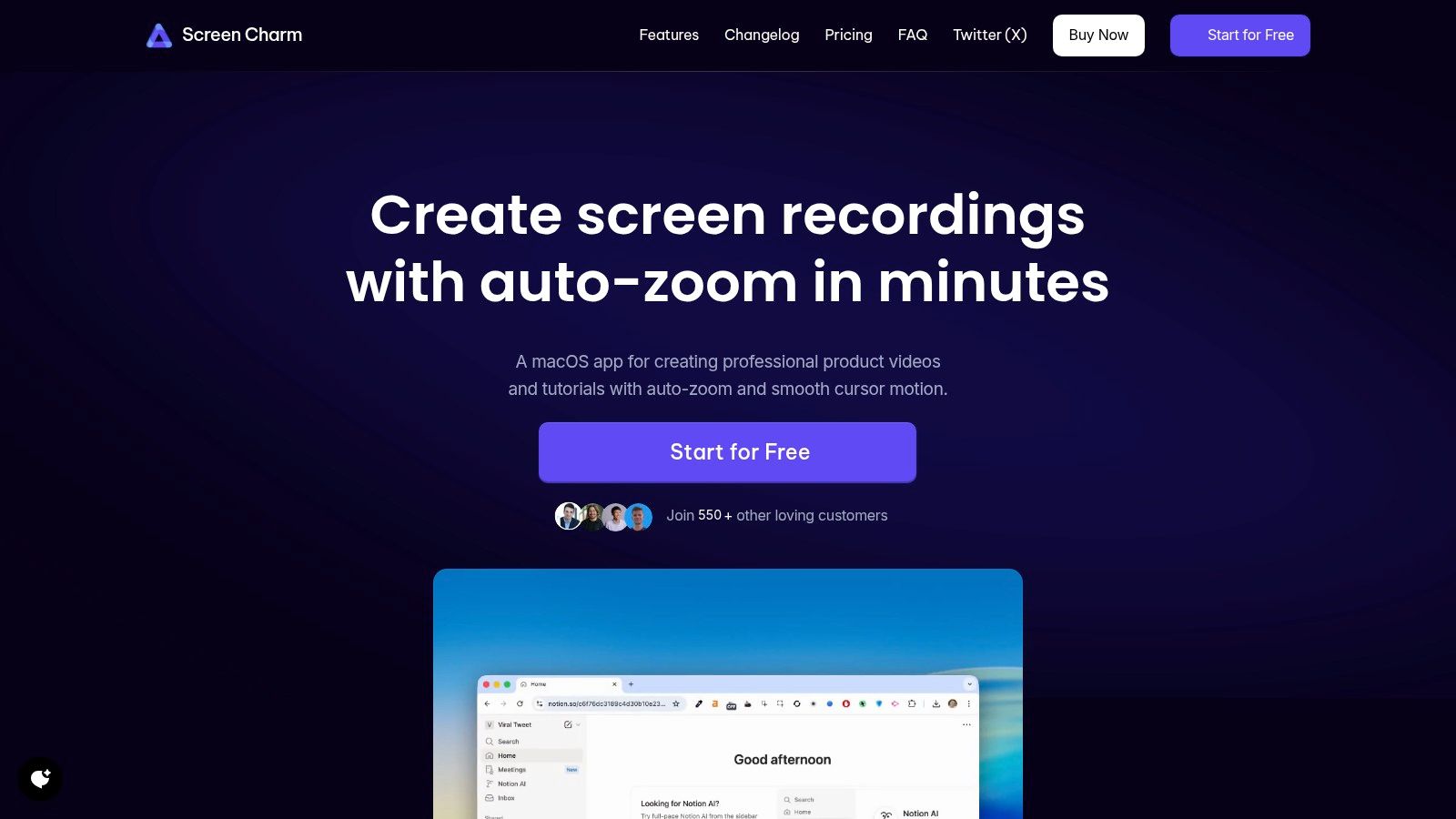| Screen Charm 🏆 | Record screen+webcam, smart auto-zoom, built-in editor, 4K export | ★★★★☆ — intuitive, fast workflow | 💰 $49.90 one‑time; lifetime updates; 30‑day MBG | 👥 Developers, indie makers, educators, marketers, support teams | ✨ Smart auto-zoom; integrated editor; unlimited 4K; native macOS app |