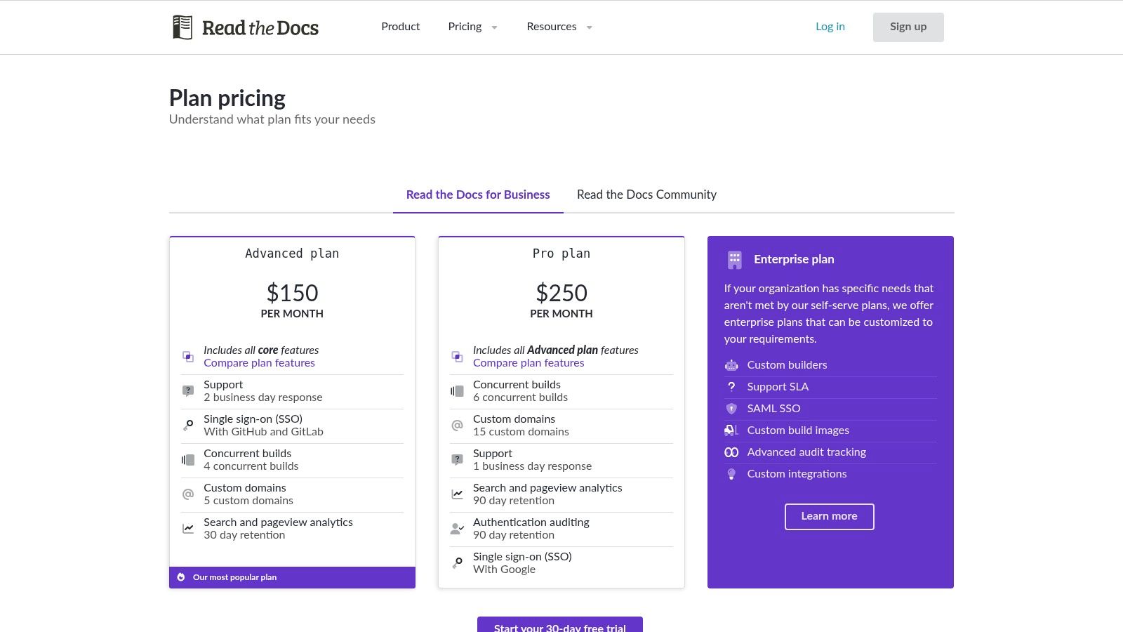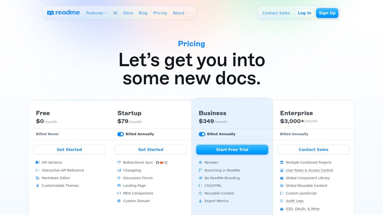 - Pricing: Free for public, open-source projects. Business plans for private docs start with the Advanced plan at $50/month, a Business plan at $150/month, and an Enterprise tier with custom pricing. Visit their official pricing page for more details.