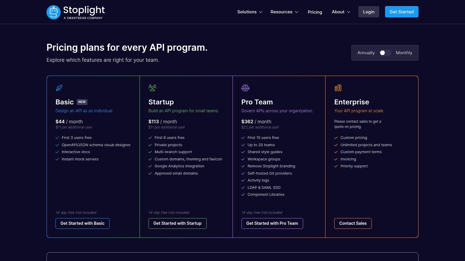 Stoplight's tiered model is designed to support teams as they scale their API programs, from individual developers to large-scale enterprise operations. The platform's transparent pricing and generous user allowances on paid tiers make it an attractive option.